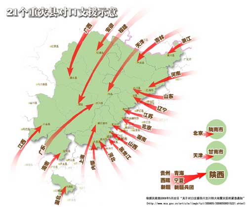 二十一個對口支援省份為上海支援都江堰市,湖南支援彭州市,黑龍江支援溫江區(qū),山西支援郫縣,內蒙古支援大邑縣,河北支援崇州市,江蘇支援綿竹市,北京支援什邡市,遼寧支援安縣,山東支援北川縣,吉林支援平武縣,河南支援江油市,廣東支援汶川縣,福建支援理縣,天津支援茂縣,安徽支援松潘縣,江西支援小金縣,廣西支援黑水縣,浙江支援青川縣,湖北支援漢源縣,海南支援寶興縣。