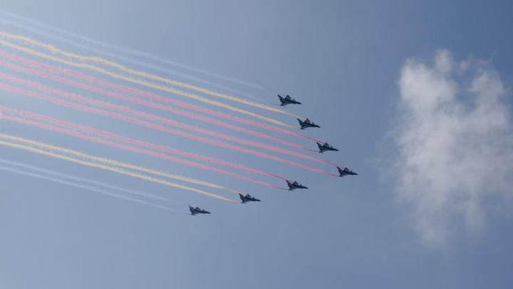 空中梯隊完整視頻丨呼嘯而來!戰(zhàn)機拉出14道彩煙象征14年抗戰(zhàn)