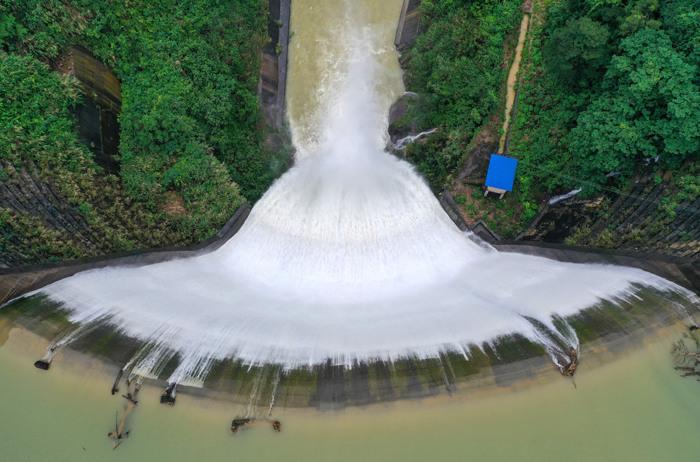 近日連降大雨,廣西桂林市全州縣源口水庫溢洪瀑布迎來最佳觀賞期。無人機(jī)俯瞰水庫溢洪口,一泓碧水從50余米壩面流落,宛如一把柔美的白色蒲扇輕柔落下,美輪美奐。源口水庫雨季溢洪場景已成為當(dāng)?shù)厥忻翊蚩ǖ亍?圖片來源:ICphoto