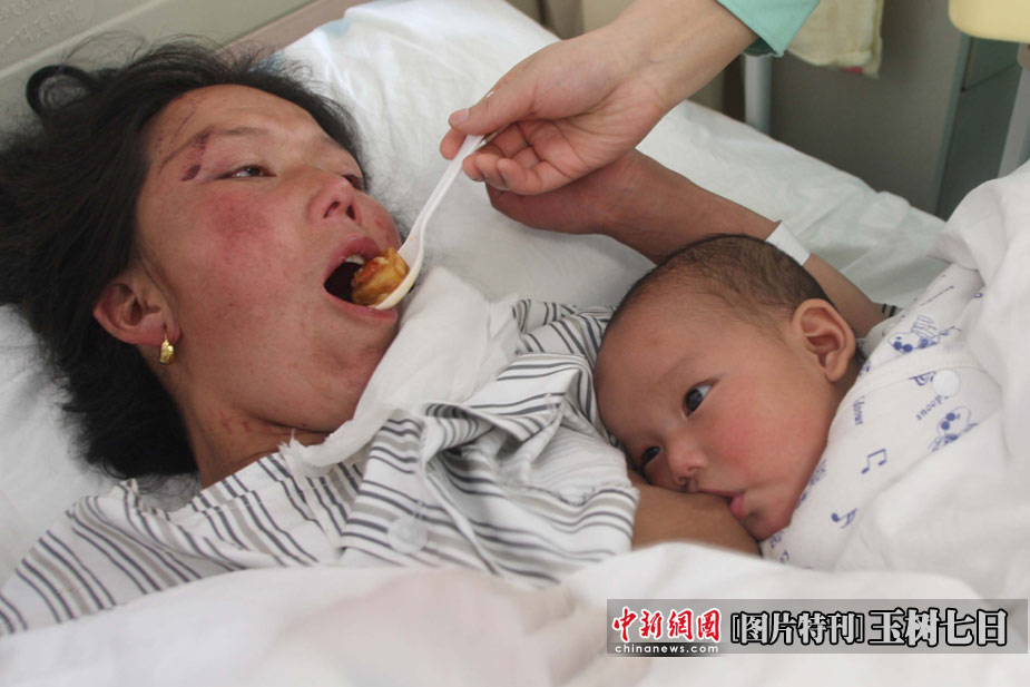 4月16日上午,護(hù)士正在給地震傷員30歲的尼瑪曲忠喂飯,她懷中4個(gè)月大的孩子正在吃奶。中新社發(fā) 梁萌 攝