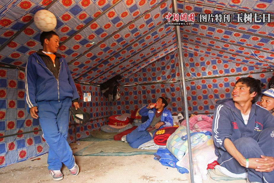 2010年4月19日,青海玉樹縣結古鎮(zhèn)玉樹縣第一民族中學的學生宿舍帳篷內,德尕扎西(左)在其他同學面前表演球技,稱自己是“C羅”。中新社發(fā) 盛佳鵬 攝