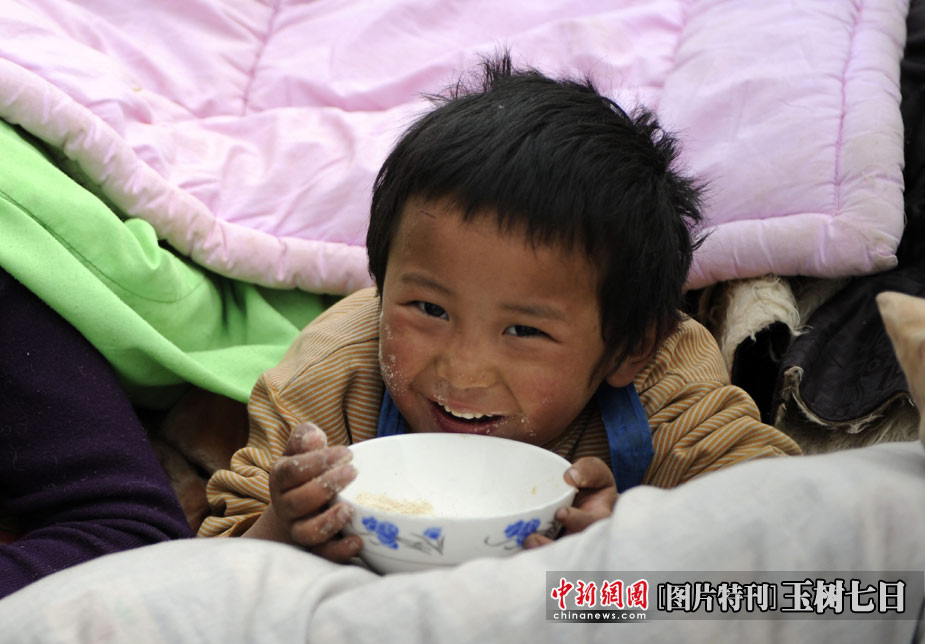 災(zāi)難的來臨無法選擇,但是面對災(zāi)難的方式,卻始終掌握在每個人自己手中。家園被毀,失去親人,傷痛過后生活還要繼續(xù),愿玉樹的受災(zāi)群眾選擇堅強,用堅韌和信心去開創(chuàng)新的生活。 圖為青海玉樹體育場地震民眾安置點,一名孩童歡快地吃東西。中新社發(fā)  廖攀 攝