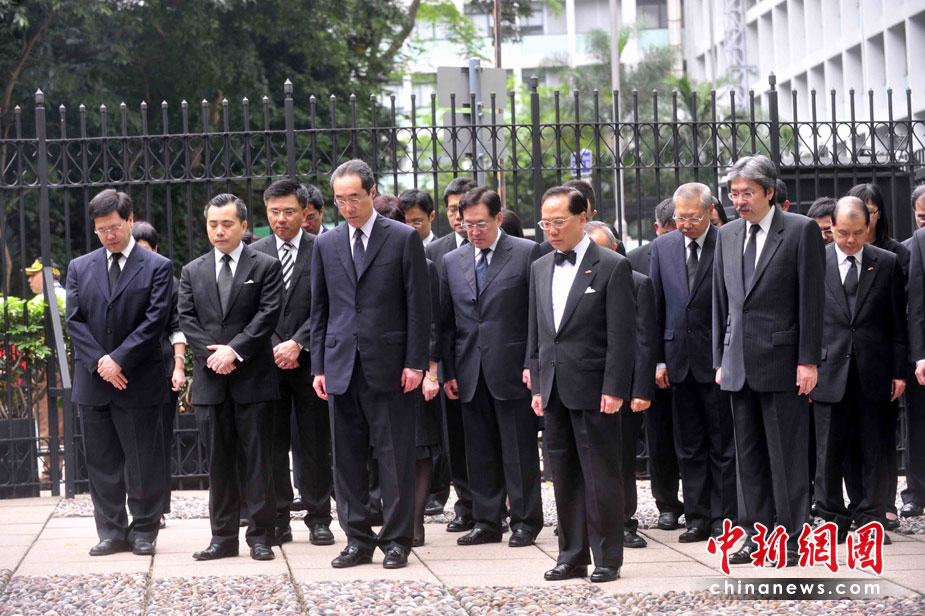 4月21日,配合全國(guó)哀悼青海玉樹(shù)地震遇難同胞,香港特別行政區(qū)所有政府機(jī)構(gòu)下半旗致哀,行政長(zhǎng)官曾蔭權(quán)率領(lǐng)政府高層人員,在政府總部默哀。中新社發(fā) 譚達(dá)明 攝