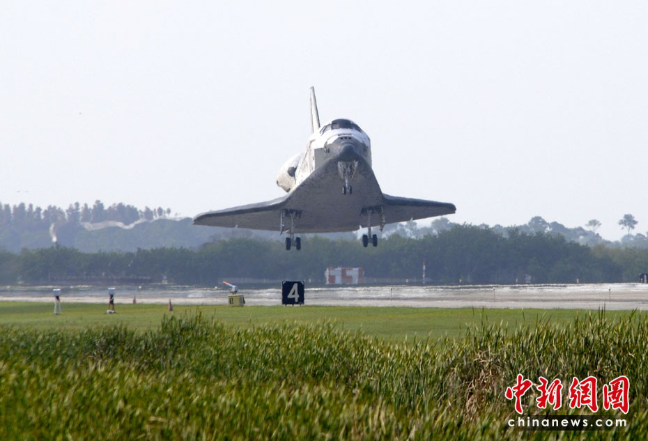 美國(guó)發(fā)現(xiàn)號(hào)航天飛機(jī)于當(dāng)?shù)貢r(shí)間4月20日成功降落在佛羅里達(dá)州肯尼迪航天中心,結(jié)束了為期15天的國(guó)際空間站建設(shè)之旅。圖片來(lái)源:中國(guó)新聞網(wǎng)